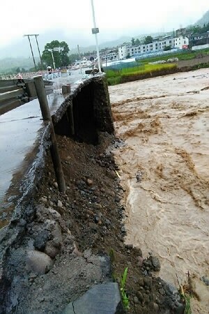9月11晚骤降暴雨,雨量增大洪水肆虐,在9月12日7:12分攀枝花市米易公路养护管理段丙谷养护站职工巡路发现因洪水冲刷,造成省道S214线丙谷新桥桥头(K46+500)左侧路基垮塌,挡墙冲毁,路面完全悬空。接到灾情报告后,米易段立即启动桥梁抢险应急预案,对该桥设置警示标志实行全面封道,进行交通管制,途经车辆大车从米易、垭口进入高速路通行,小车从撒莲方向绕行。因处置及时,确保了过往车辆和行人的安全。