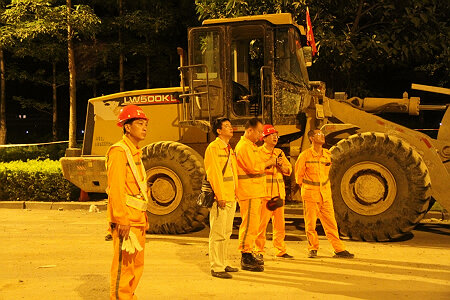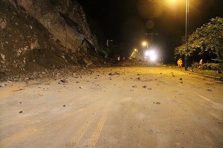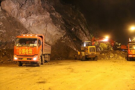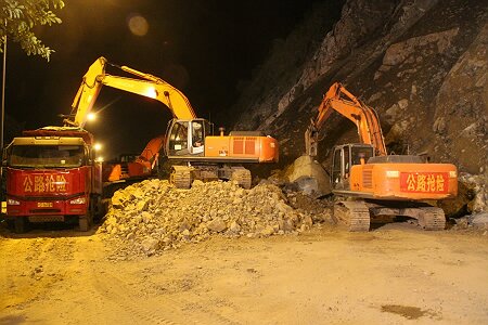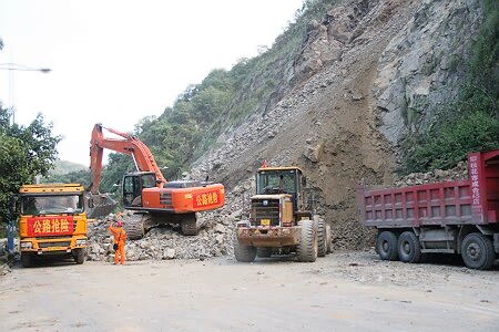 2015年9月20日下午15时,第二次山体爆破实施,并在爆破后,安排人员上山撬下浮石,但效果仍不理想,滑坡体继续零星垮塌。当日17时,总段在滑坡体相对稳定的间隙,连夜奋战,组织机械、人员清除所有坍方。由于险情仍然存在,故交通仍封闭。