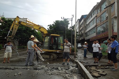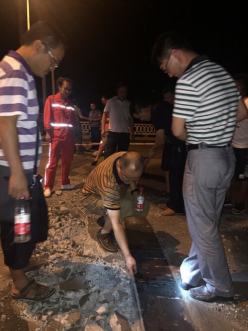 6月2日下午15:50许,在拆除0#桥台处面板施工过程中,该桥发生新的病害,左幅桥面1#伸缩缝处面板拱起,面板折断,多处产生纵向裂缝。总段会同市局、交警、专家组等相关领导和人员现场察看新发病害并召开处置措施工作研讨会,总段根据现场会议要求和病害处置实际情况,及时增加了机械设备,迅速组织好施工队伍投入抢险维修工作。截至6月3日16:00许,已完成对病害桥面面板的挖除施工工作。