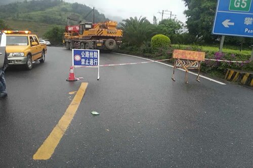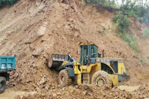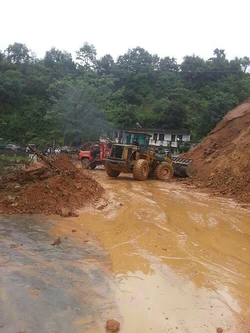 受近期强降雨影响,从20日7:30时起,省道214线K69+400处(小地名:干田堡)持续发生边坡塌方,超过3000立方米泥土涌入公路路面。米易段立即启动抢险应急预案,为确保过往车辆和行人安全,对该路段采取了断道封闭的临时交通管制措施,在山体趋于相对稳定时组织机械设备、抢险人员在于13:00实施抢险保通施工工作。由于降雨仍在继续,山体结构呈现不稳定状态,存在严重安全隐患,加之夜间视线条件不利于施工,抢险工作于当日18:00被迫停止,在设置好安全警示标志标牌后,抢险设备和人员撤离现场,待21日视线条件恢复后,继续开展抢险保通工作。
