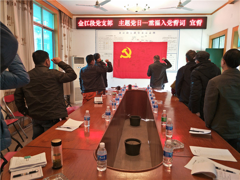 2017年12月19日,金江段党支部开展了主题党日活动,学习了党的十九大精神,组织全体党员面对党旗庄严宣誓, 重温入党誓词。通过学习、宣誓让每一位党员恪守承诺,回头看看自己在2017年度做过的事、干过的工作,找出其中的不足,用十九大精神作引领起好党员模范带头作用。