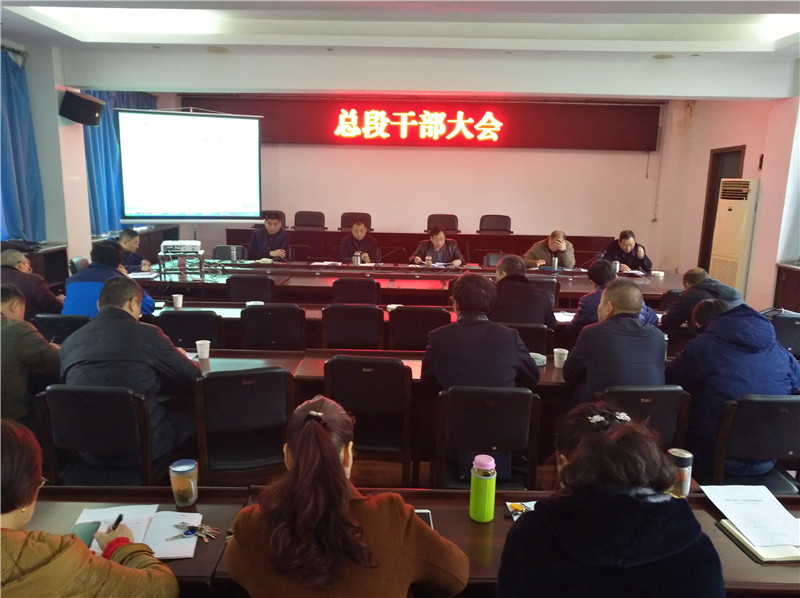 2018年1月12日上午,在总段新三楼会议室召开总段干部大会,总段领导班子成员、基层单位党政负责人、机关正科级及以上干部参加会议。会议一是安排布置“两转一提”第二阶段工作;二是传达市第三巡视组反馈意见,安排布置整改工作;三是学习贯彻党的十九大精神,部署意识形态工作;四是开展领导班子及成员年度考核测评;五是开展《领导干部个人事项报告表》填报培训。