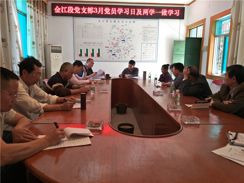 2018年3月5日,金江段党支部开展了主题党日活动,传达学习了总段党委《关于报送落实市交通运输局党委关于市委第三巡视组对市交通运输局党委巡察反馈意见整改方案》、市交通运输局党委《关于印发2017年度党建工作总结及2018年工作安排的通知》及《2017年交通运输系统党风廉政建设工作总结及2018年工作安排的通知》、市纪委《关于5起违反中央八项规定精神问题典型案例的通报》、省交通运输厅党组《关于贯彻落实中央八项规定精神和省委、省政府十项规定的实施细则的通知》。要求全体党员职工认真学习、领会,并结合十九大会议精神,结合实际落实到工作、生活中去,廉洁自律,不断提高自身素质。