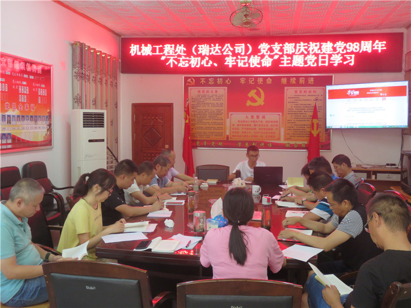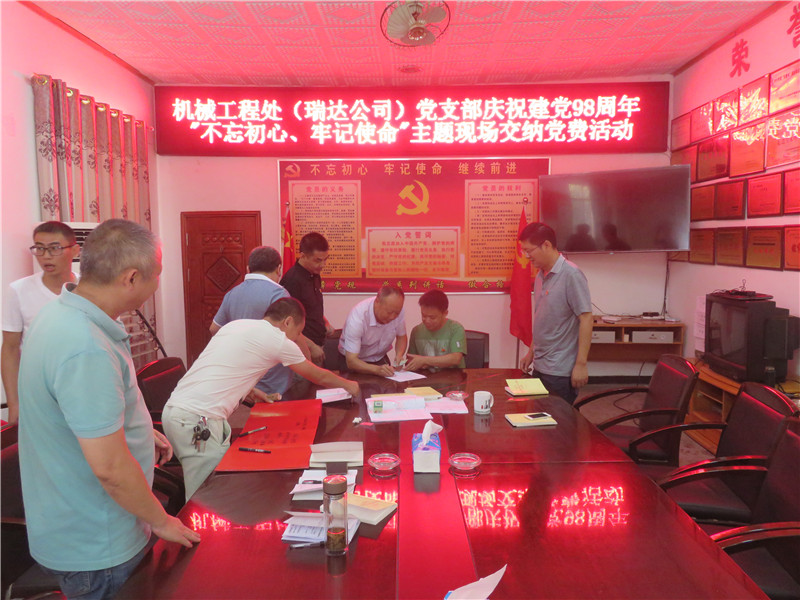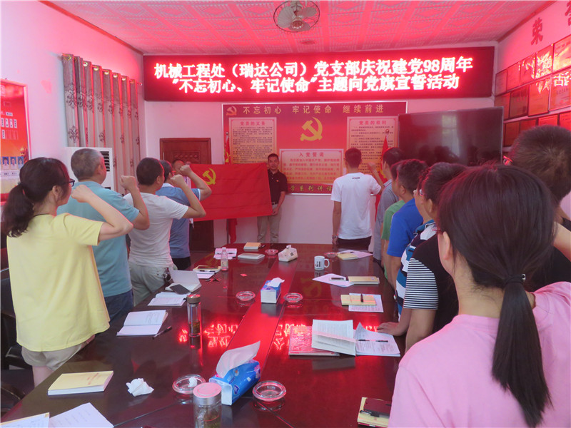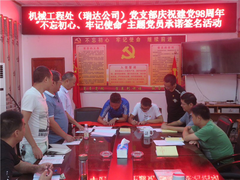 6月20日,机械工程处(瑞达公司)党支部以“不忘初心、牢记使命”为主题组织开展庆祝建党98周年系列活动。活动中,集体学习了《习近平新时代中国特色社会主义思想学习纲要》开篇—习近平新时代中国特色社会主义思想是党和国家必须长期坚持的指导思想、《中国共产党党员教育管理工作条例》。要求党员同志要以集中学习和个人自学相结合,认认真真读原著、学原文、悟原理,深入学习领会习近平新时代中国特色社会主义思想的时代意义、理论意义、实践意义、世界意义,深刻理解其核心要义、精神实质、丰富内涵、实践要求,坚持不懈地用习近平新时代中国特色社会主义思想武装头脑、指导实践、推动工作。党支部要不断加强党员教育管理,引导党员坚定共产主义远大理想和中国特色社会主义共同理想,增强“四个意识”、坚定“四个自信”、做到“两个维护”,努力建设一支思想政治合格、执行纪律合格、道德品质合格、发挥作用合格的党员队伍。活动中,全体党员面向党旗重温入党誓词,党员现场承诺签名、交纳党费。