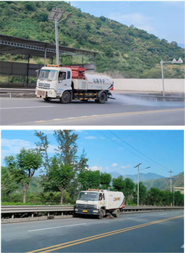 “人工+机械”强化路面日常保洁。针对公路扬尘污染较重和重要城区路段,采用“人工+机械”模式,加大公路清扫保洁力度,增加公路清扫、洒水降尘和路面冲洗频次。每天投入5台清扫车、1台洒水车和近40名养护人员对红雅线、机场路、省道221线民政段、国道227线路歇桥至总发段、新雅江桥等线路桥梁进行重点作业,并根据天气、公路实际情况,随时增加保洁频次。
