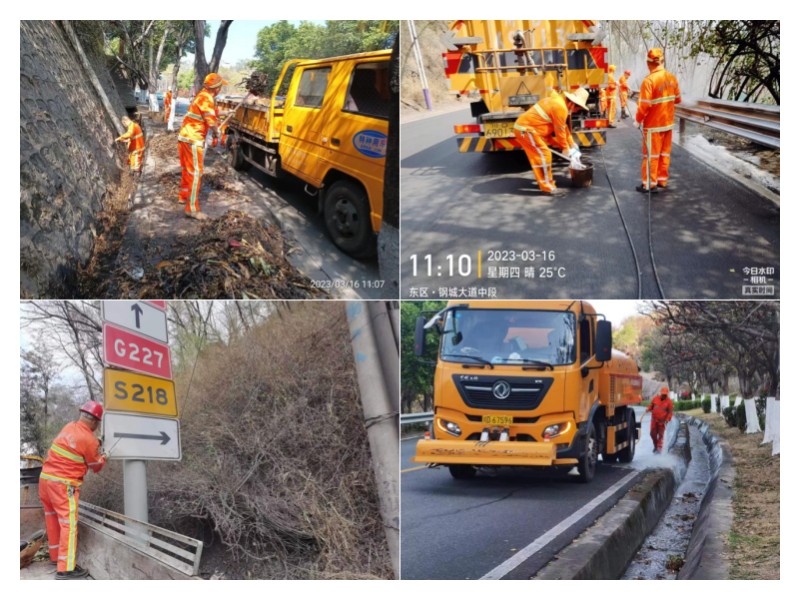 总段3月16日至17日创文工作开展情况:对机场路、渡金线、渡仁西线、倮渡北线、炳清线五条城市主次干道及其他管养国省干线公路进行巡查,投入巡查督导人员105人次、巡查车辆52台次;投入人员621人次,投入机械76台次,清扫路面76万平方米,路面冲洗、雾化扬尘45公里,清理边沟3万米,清理路肩2610平方米,清理白色垃圾1573平方米,修复人行道地砖200平方米,修复破损边沟130立方米,清运垃圾41.2吨,清理涵洞23道,清理桥梁伸缩缝4道,清洗标志牌20块,修补路面裂缝4000米,更换水沟盖板46块,清洗波形护栏1.1万米,修补挡墙抹面砂浆层400平方米。
