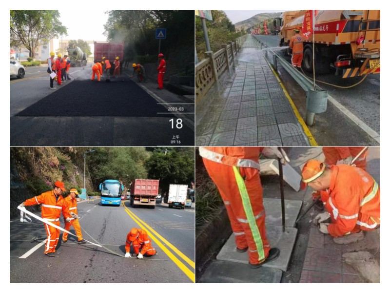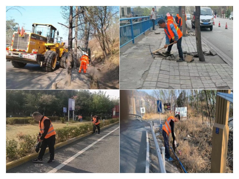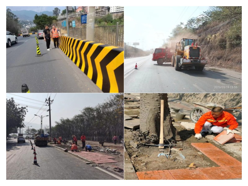 2023年3月18日至20日总段创文工作开展情况:对机场路、渡金线、渡仁西线、倮渡北线、炳清线五条城市主次干道及其他管养国省干线公路进行巡查,投入巡查督导人员123人次、巡查车辆57台次;投入人员591人次,投入机械99台次,清扫路面89万平方米,路面冲洗、雾化扬尘157公里,清理边沟1.6万米,清理路肩1589平方米,清理白色垃圾2243平方米,修补路面病害1227平方米,拆除人行道地砖1400平方米,修复人行道地砖614平方米,修复边沟5.9立方米,清运垃圾124吨,清理涵洞15道,擦洗桥梁栏杆1326平方米,清理桥梁伸缩缝22道,修补路面裂缝6080米,更换排水沟盖板83块,修补路缘石183立方米,挡墙砂浆抹面400平方米,擦洗轮廓标165个,恢复中央隔离栏18米,施划标线370平方米。