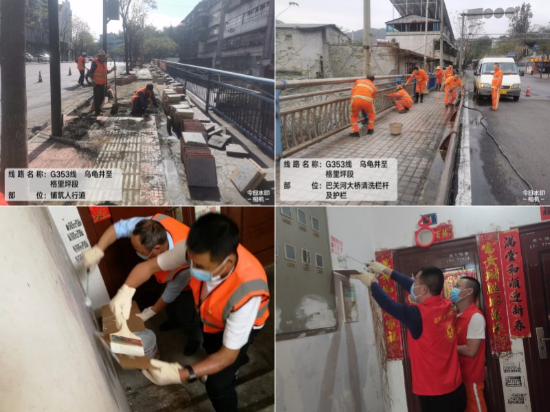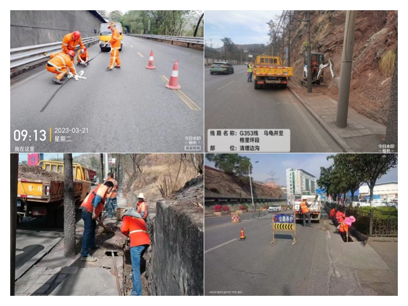 总段3月21日至22日创文工作开展情况:对机场路、渡金线、渡仁西线、倮渡北线、炳清线五条城市主次干道及其他管养国省干线公路进行巡查,投入巡查督导人员121人次,巡查车辆59台次;投入人员649人次,投入机械83台次,清扫路面678000平方米,路面冲洗、雾化扬尘104.45公里,清理边沟29390米,清理路肩2920平方米,清理白色垃圾771平方米,修补路面病害23.49平方米,修复人行道地砖435平方米,修复破损边沟18.5立方米,清运垃圾121.2吨,擦洗桥梁栏杆866平方米,清理伸缩缝16道,清洗标志牌16块,贴缝带修补路面裂缝210米,更换安装水沟盖板31块,修补路缘石38.75立方米,清洗创文宣传标牌77块,沥青灌缝4000米,防撞墙刷漆513平方米,校正标志牌7块。