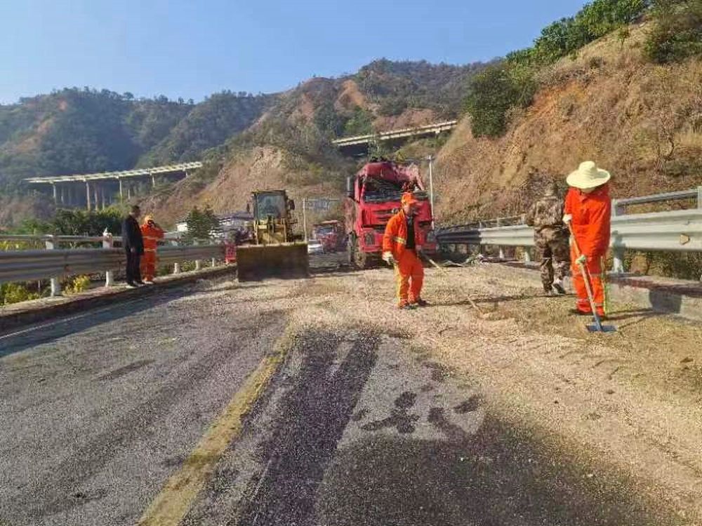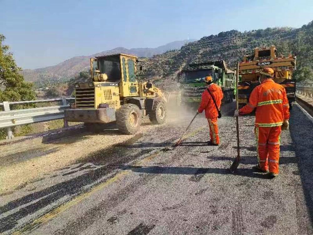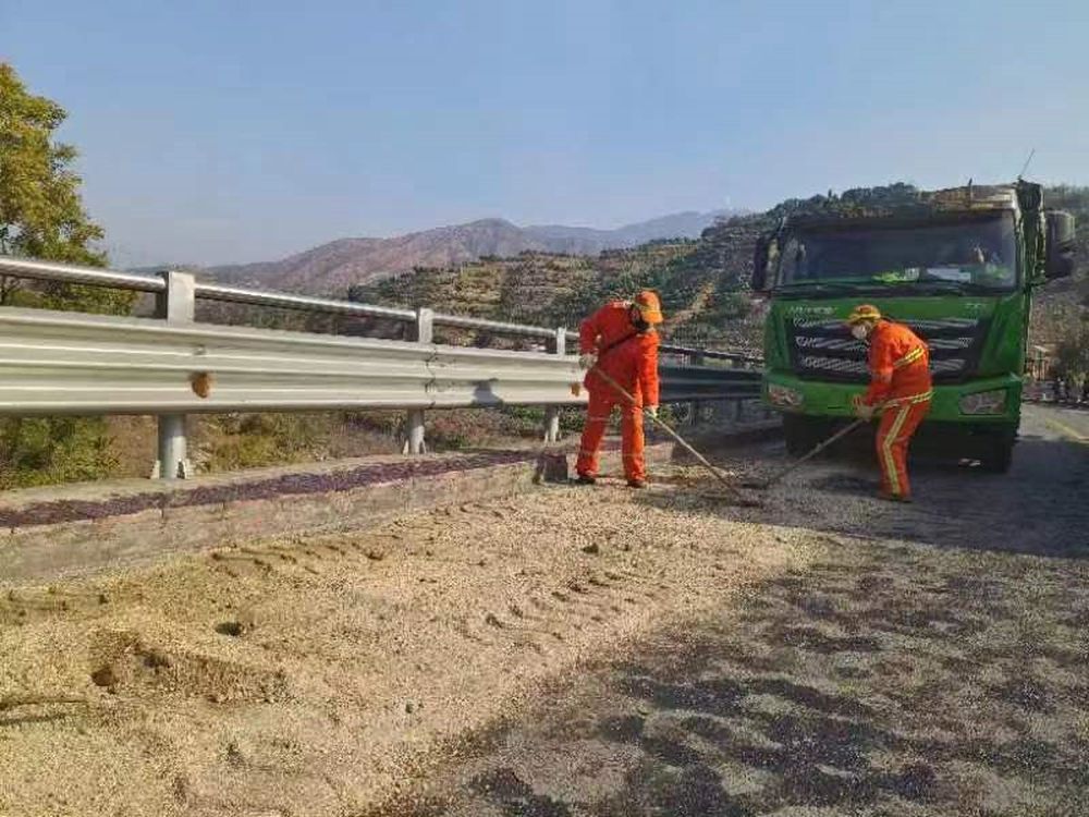 2024年1月12日8:30,大渡口公路养护段在开展道路巡查工作中发现,G227线K2639+100路段(雪清松桥)发生一起车辆侧翻事故。事故造成道路中断,道路桥梁受损,且现场路面有大量的抛洒物及油污污染。为保障道路安全畅通,防止二次事故发生,大渡口公路养护段立即组织人员对事故现场道路桥梁受损情况进行勘察,对事故现场路面抛洒物、油污进行处置。经过快速、有效的处置,此路段于11:40恢复单向通行。下午16时,路面抛洒物及油污被彻底清洗干净,消除了通行隐患,公路恢复了畅通。
