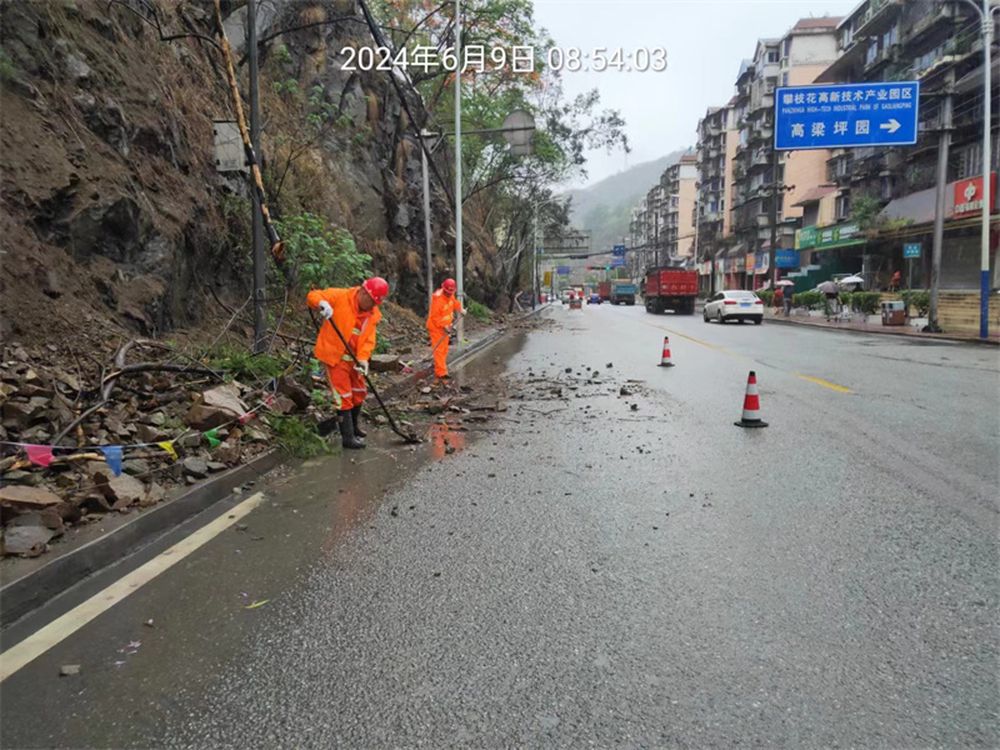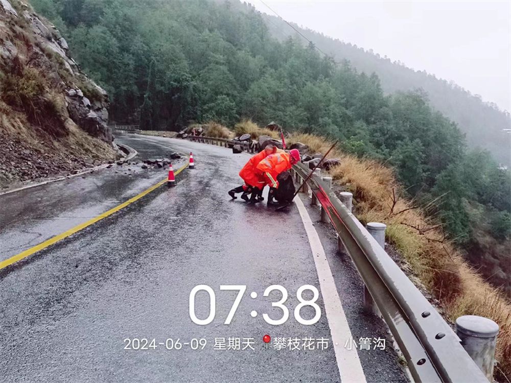 受6月8日晚至9日持续降雨影响,国道227线k2621+00-k2623段(仁和路斜桥至总发段)发生多处约3000立方米泥石流、10余处行道树倒伏,造成6处道路临时阻断。险情发生后,市公路养护总段立即启动保通保畅应急预案,第一时间组织力量赶赴险情一线。6月9日凌晨2:00许,市公路养护总段组织约10名抢险人员、3台抢险机械设备在仁和区政府的协助下,对该路段险情进行紧急处置,经过抢险队伍紧张有序的抢险作业,6月9日凌晨4:00许,该路段清理出半幅路面,车辆可以交替有序通行,鉴于雨情和夜晚视线不佳等不利因素,抢险作业暂时停止,待天亮后继续开展抢险作业。